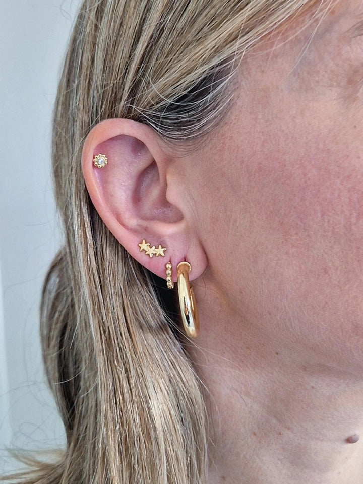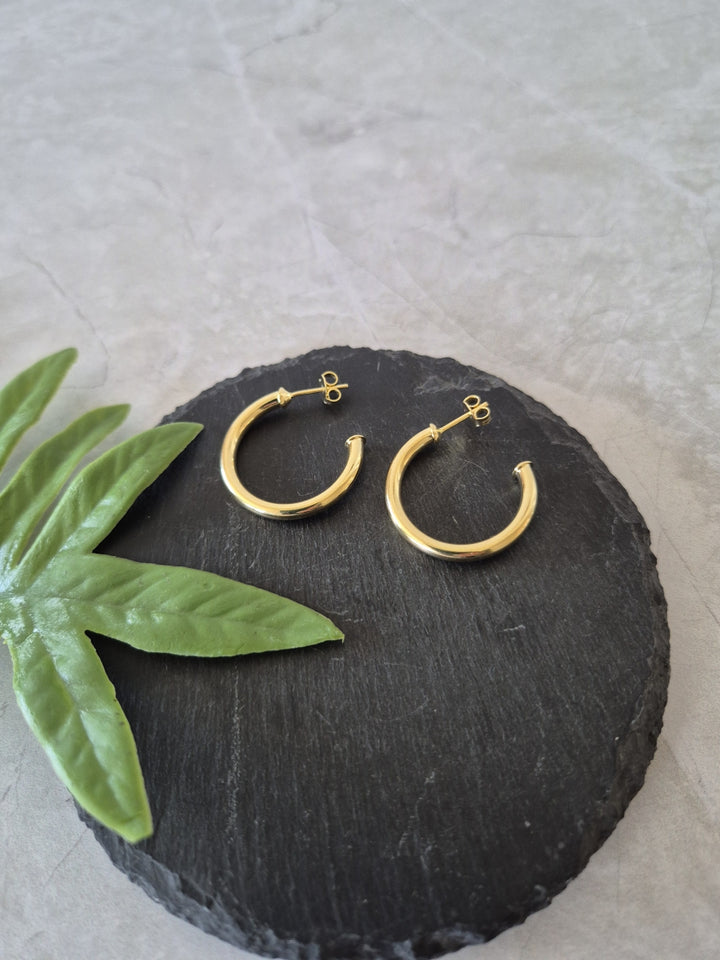 Son ese básico infaltable que va con todo. De diseño simple y elegante, están bañadas en Oro y tienen el tamaño justo para usar a diario o combinar con otros aros si te gusta el mix & match.