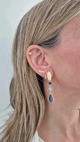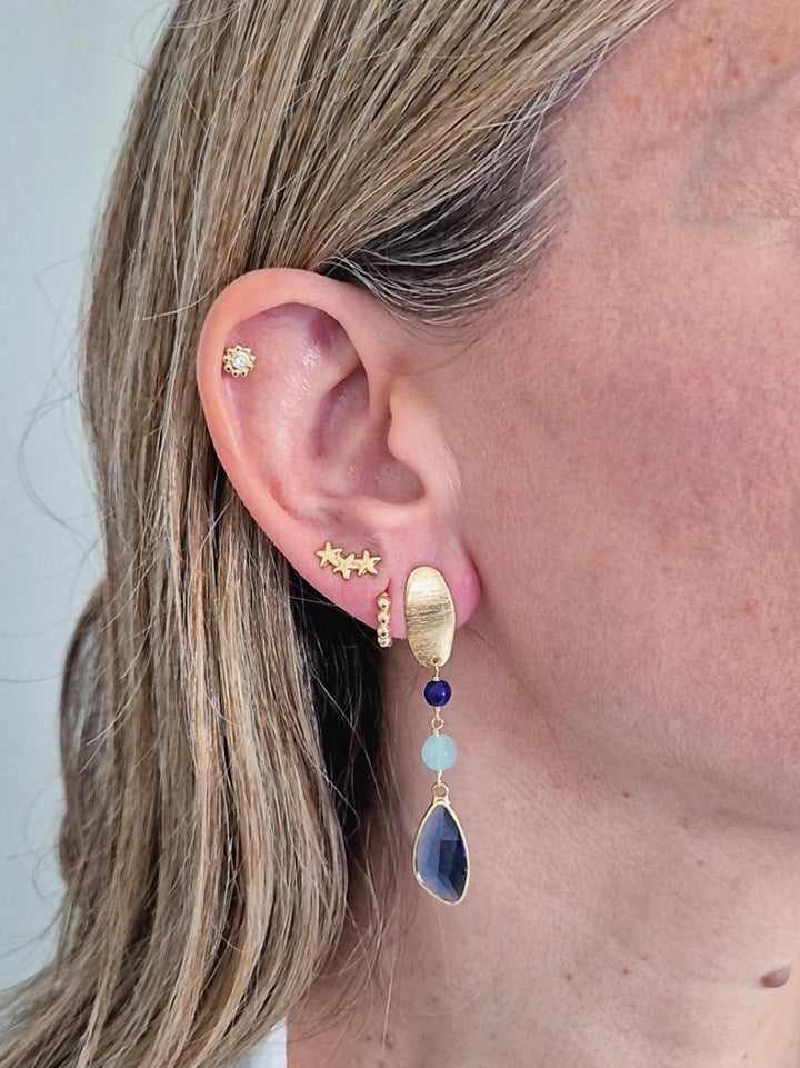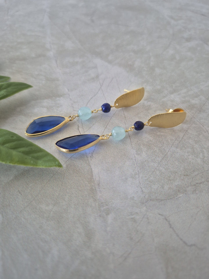 Pura luz y movimiento. Combinan un cristal azul intenso con piedras naturales de ágata celeste y azul, montadas sobre una base bañada en oro. Son livianos, tienen mucho balance y aportan ese toque elegante pero entretenido que levanta cualquier look.