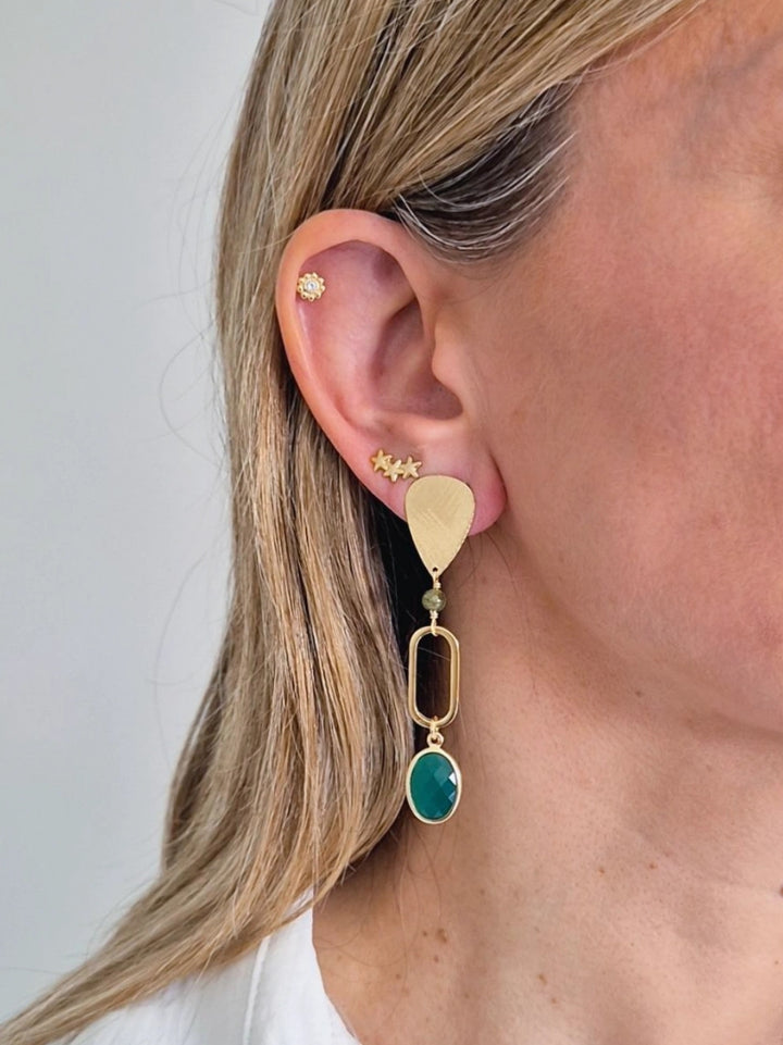 Los Aros Pola Verdes tienen ese equilibrio perfecto entre elegancia y frescura. Combinan un cristal ovalado verde con una ágata natural en tono más suave, unidos por una argolla bañada en oro que les da movimiento y un brillo sutil.