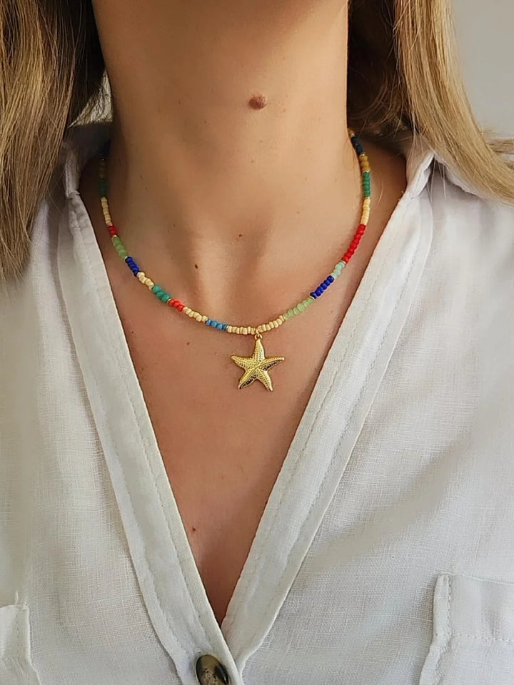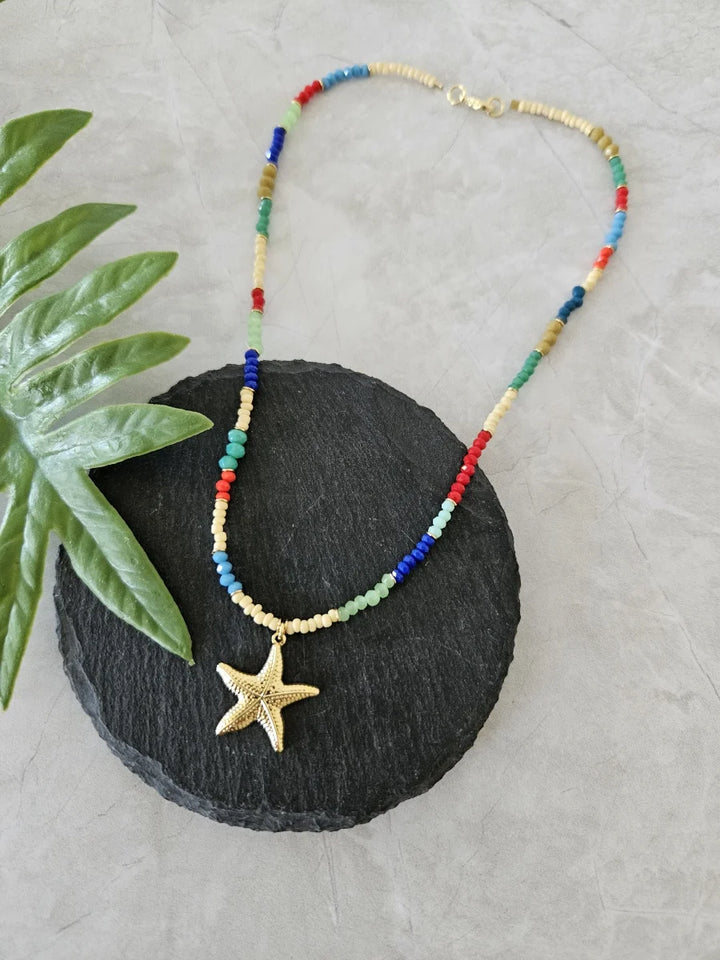 Tiene mostacillas color blanco y en vibrantes tonos multicolores, con una gran Estrella de Mar bañada en oro.