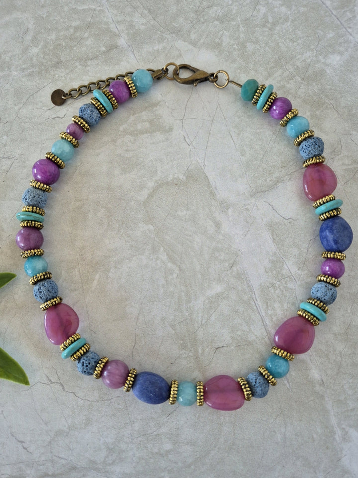 Este collar corto está hecho con piedras en tonos fucsia, turquesa, lila y azul, combinadas con separadores dorados que le dan un aire bohemio, fresco y con mucha onda. Su diseño lleno de color convierte cualquier look básico en un outfit entretenido.