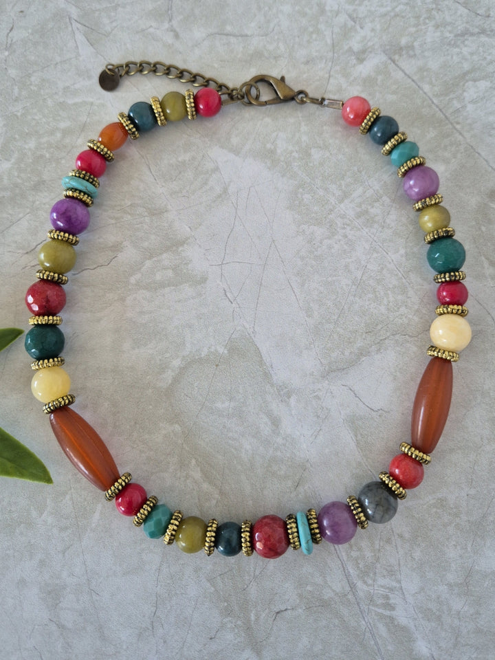 Olvídate de los looks aburridos: este collar corto de piedras es tu pase directo a robar miradas. Lleno de colores y buena onda, es de esos accesorios que levantan hasta la polera más fome y te hacen sentir poderosa, distinta y con estilo propio.