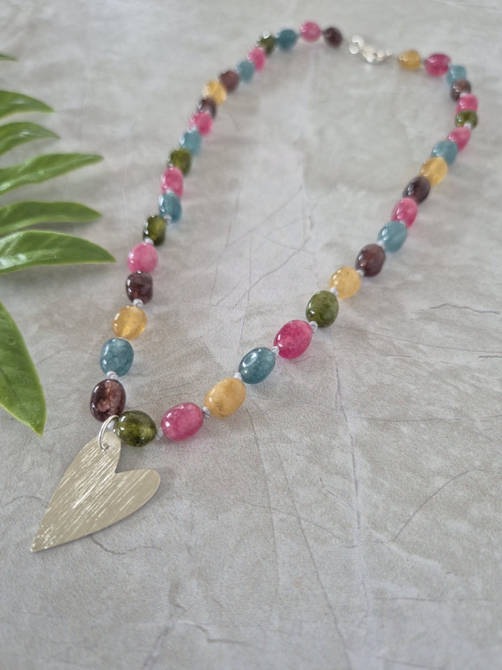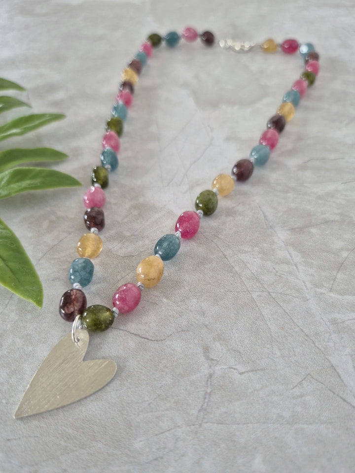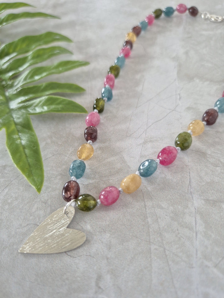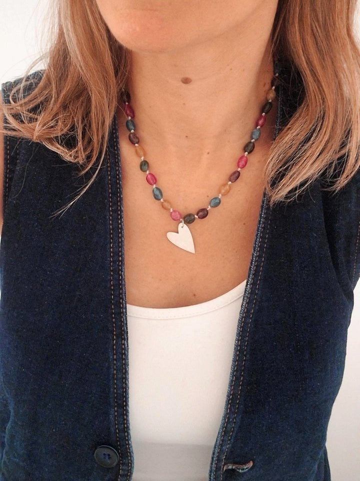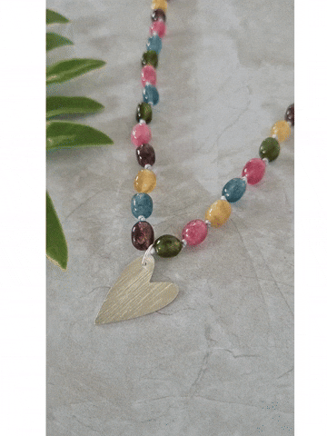 Un collar que no pasa piola. El Amor por las Turmalinas es pura vibra positiva: piedras turmalinas en tonos fucsia, verde, amarillo pastel, azul y granate, todas únicas, como tú. Al centro, un corazón bañado en plata que se convierte en el detalle perfecto para robar miradas.
