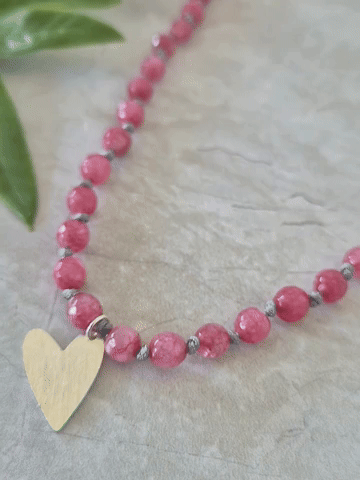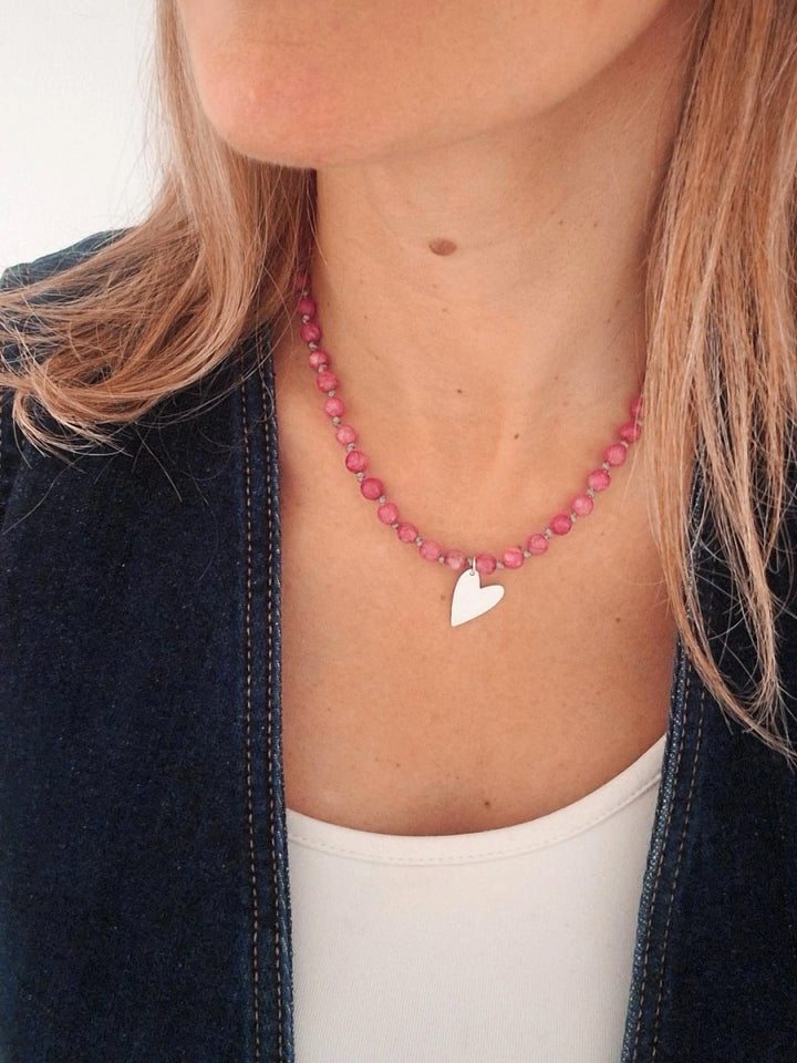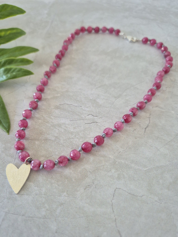Un collar que no necesita presentación: Ágatas facetadas rosadas, anudadas a mano con hilo gris y un corazón central bañado en plata que roba miradas.