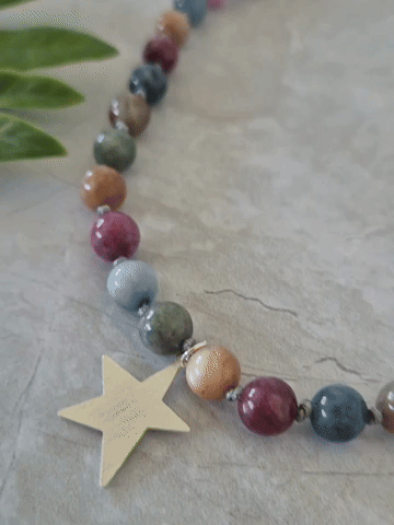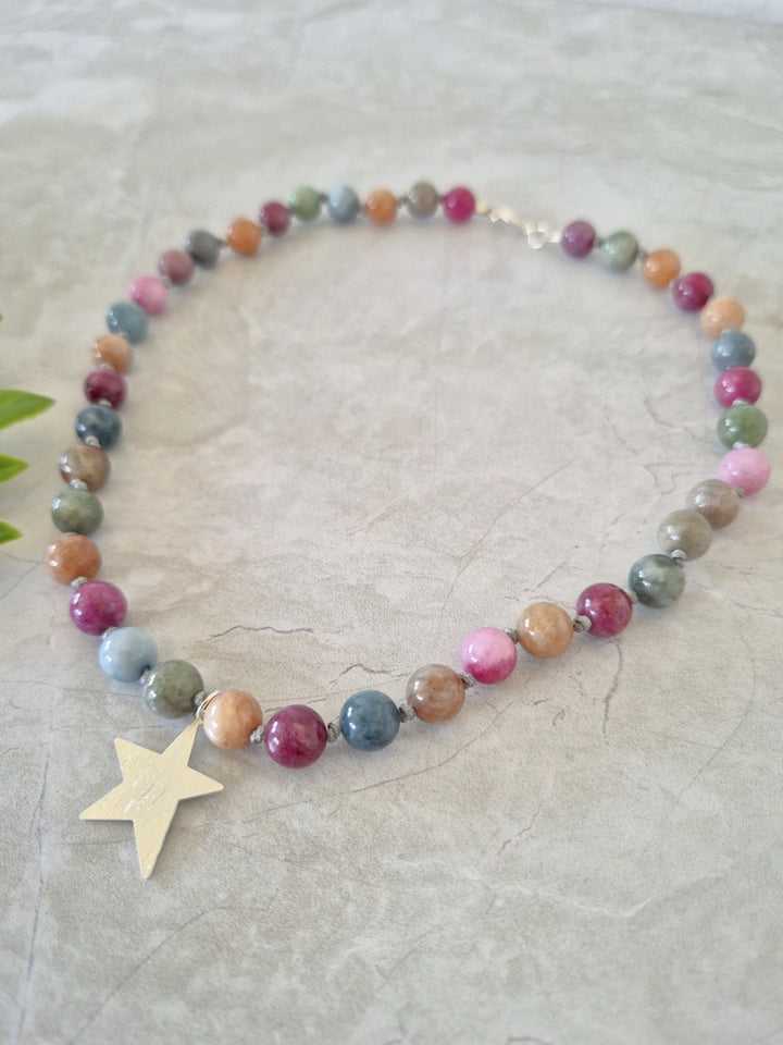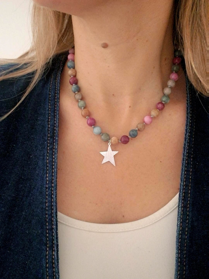 Precioso collar hecho con piedras naturales de turmalina jade en tonos pastel —rosado, verde, lavanda, calipso, camel, celeste y más—, este collar tiene una vibra mágica, relajada y femenina. Al centro una estrella irregular bañada en plata le da un toque único.