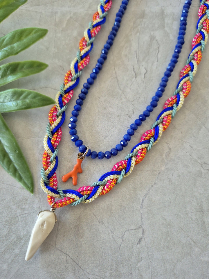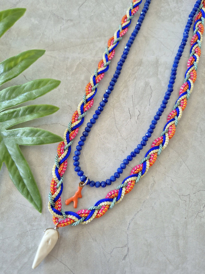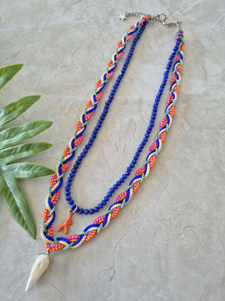 Dos capas que combinan cristales azul profundo con un charm de coral naranjo ultra playero, más una trenza de hilos en tonos azul, blanco, naranjo y verde que le da ese look fresco y lleno de onda.