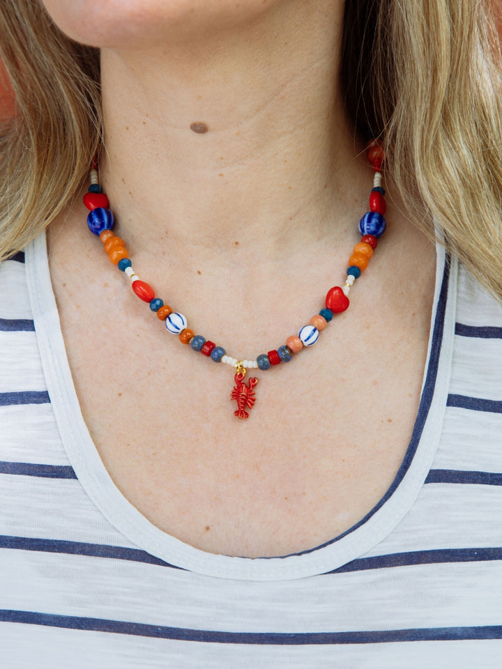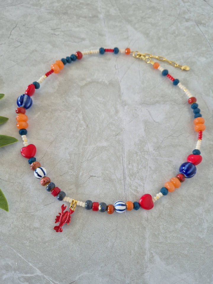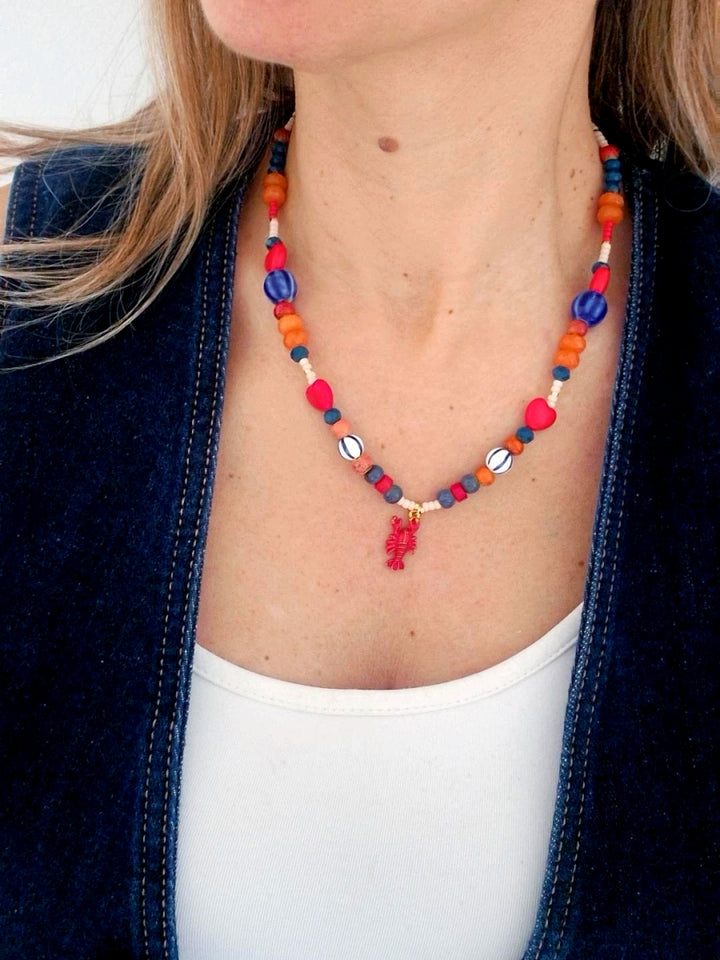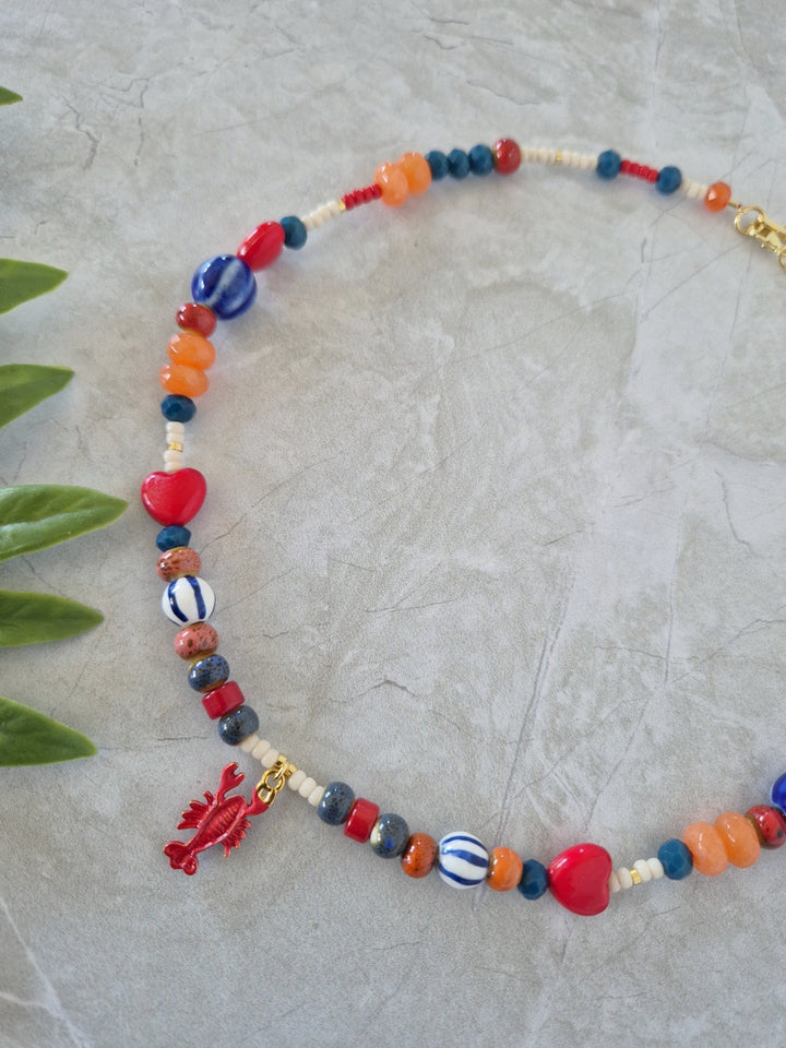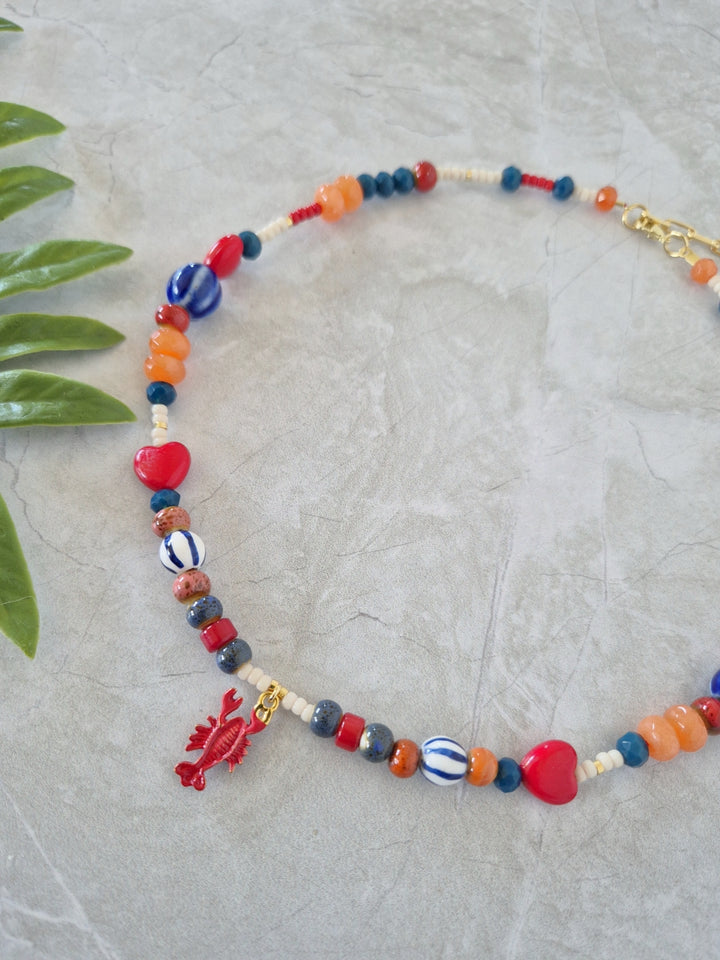 Un collar que grita verano y buena onda 🌊. Mix entretenido de piedras de cerámica, ágatas, mostacillas, corazones, cristales y vidrios en tonos naranjas, rojos y azules. Inspirado en la energía del mar y en esos días donde el sol es el protagonista. El detalle irresistible es un pequeño charm de langosta roja que le da ese toque juguetón y lleno de personalidad.
