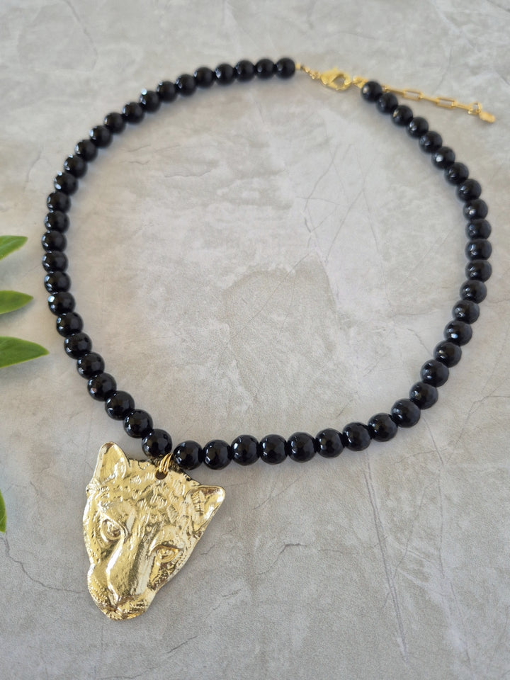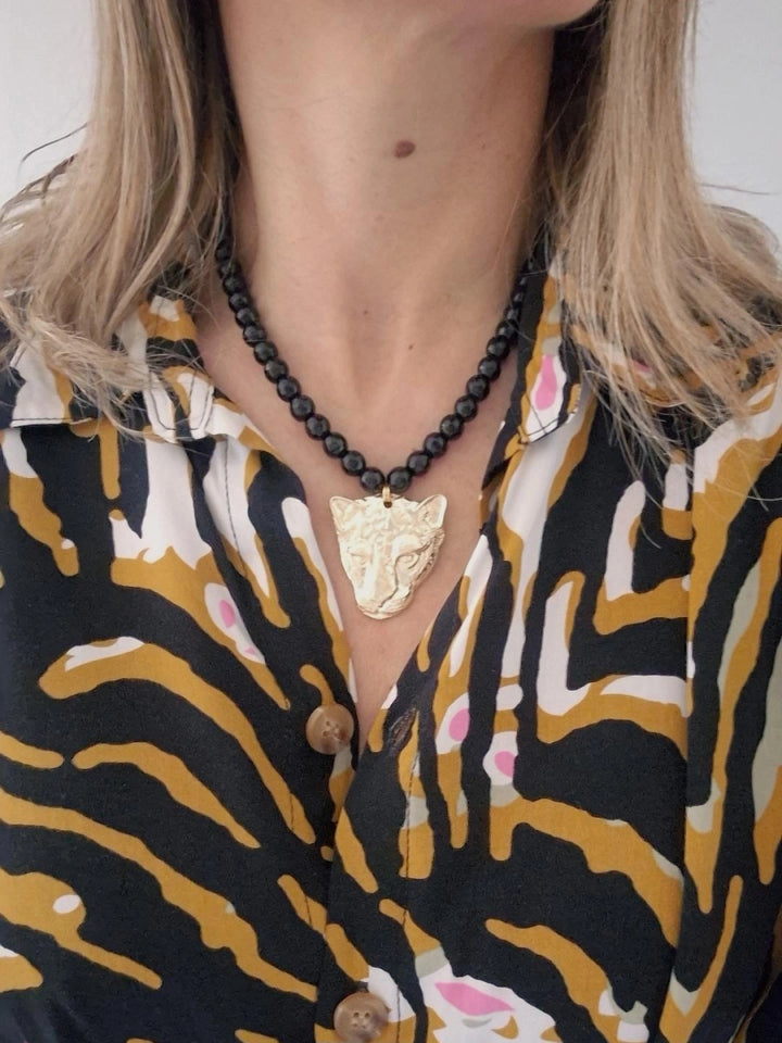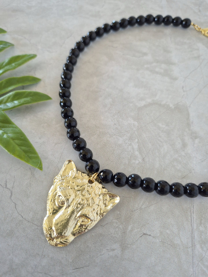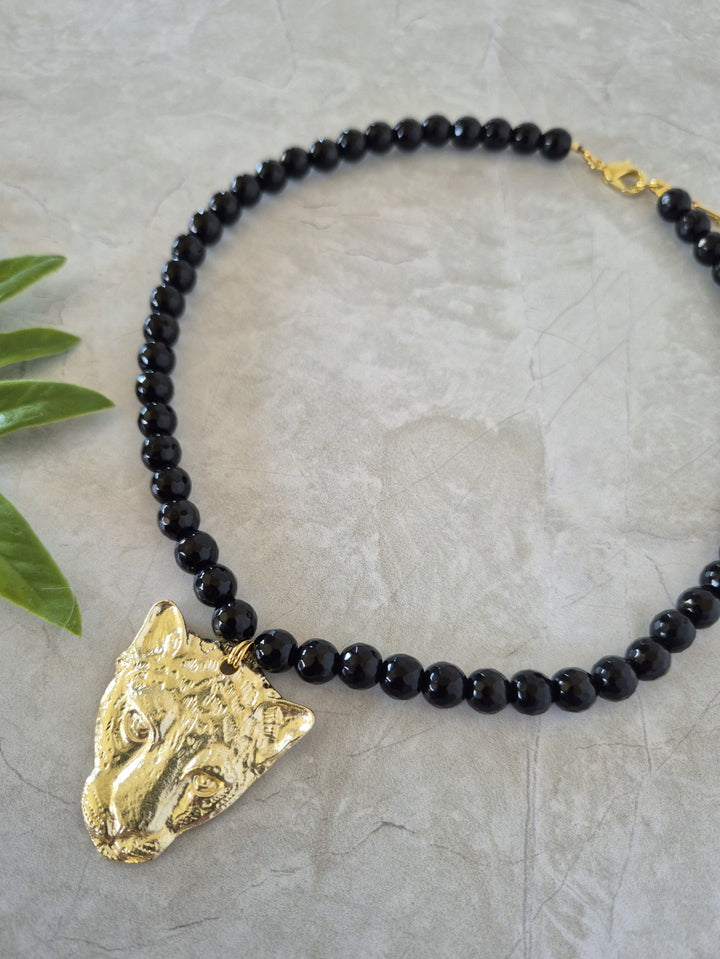 Un collar que transmite pura fuerza y estilo. Las ágatas facetadas negras imponen carácter, mientras que la cabeza de pantera bañado en oro se roba todas las miradas. La pantera simboliza poder, confianza y ese instinto salvaje que todas llevamos dentro. Ideal para mujeres que saben lo que quieren y se atreven a demostrarlo!