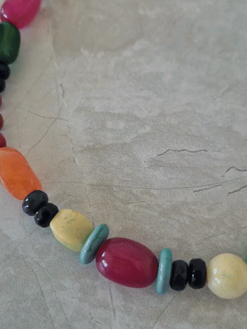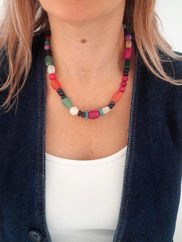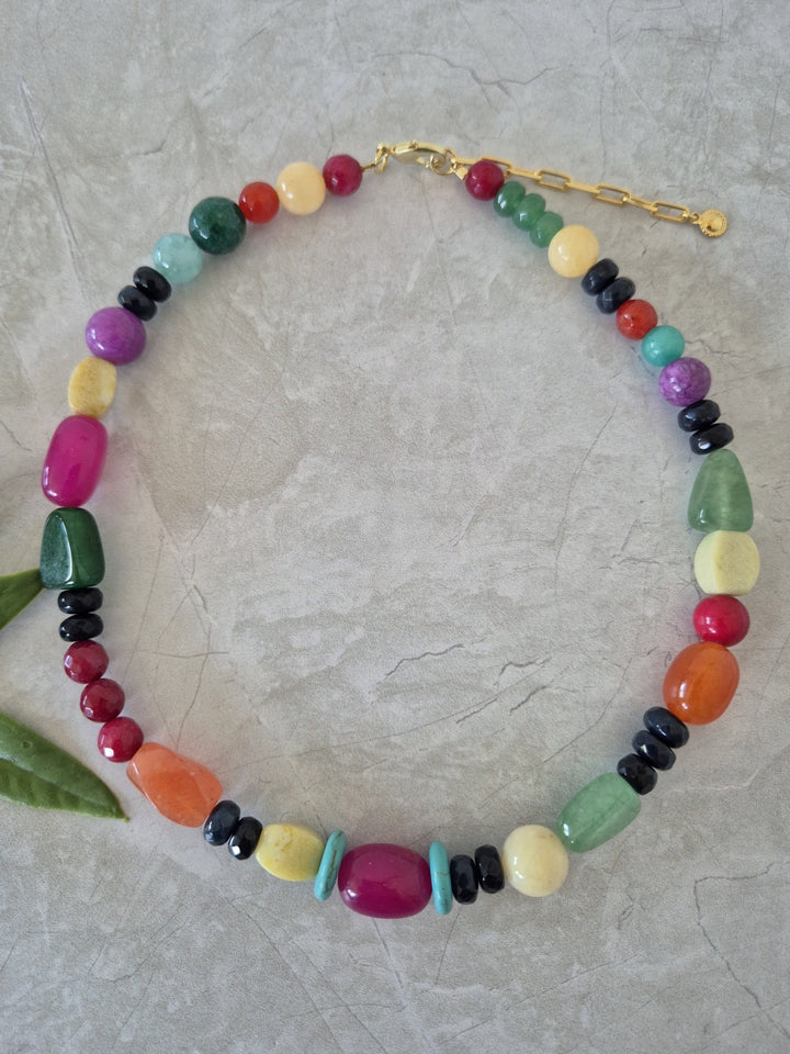 Para las que no entienden de reglas de color, y menos aún de límites. Este collar es una explosión creativa, armada con piedras multicolor de distintas formas, tamaños y texturas.