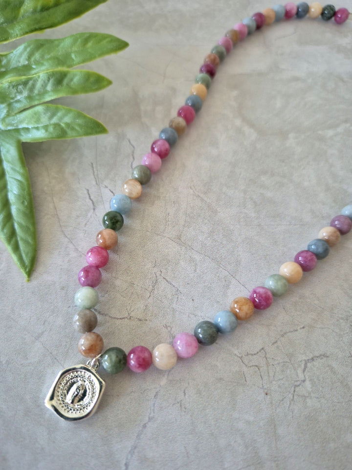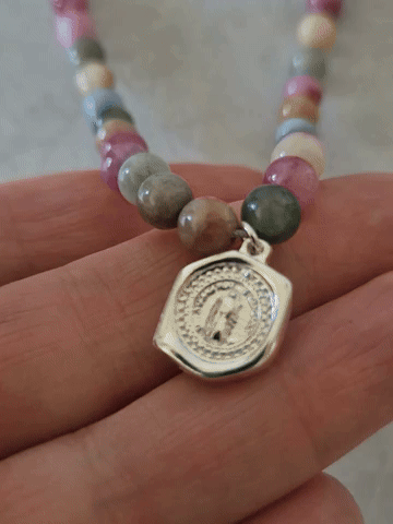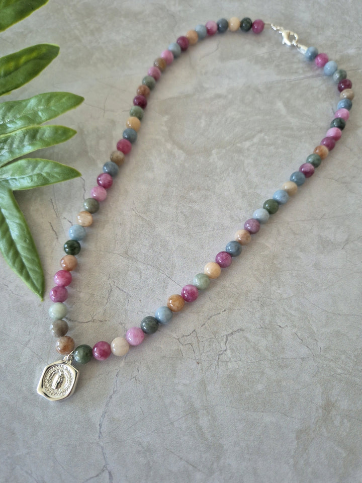 Este collar combina piedras mate multicolor con una medalla de Virgencita bañada en plata, creando una pieza especial para usar todos los días o para regalar cuando quieres decir algo más que con palabras 💫.