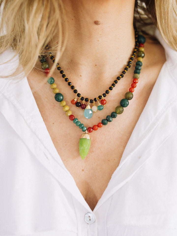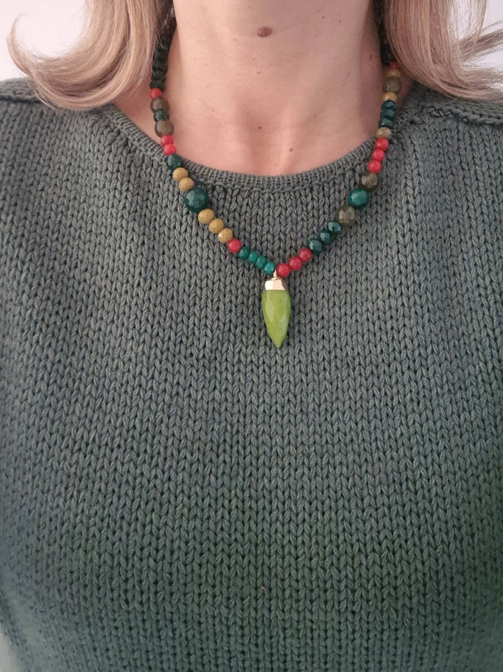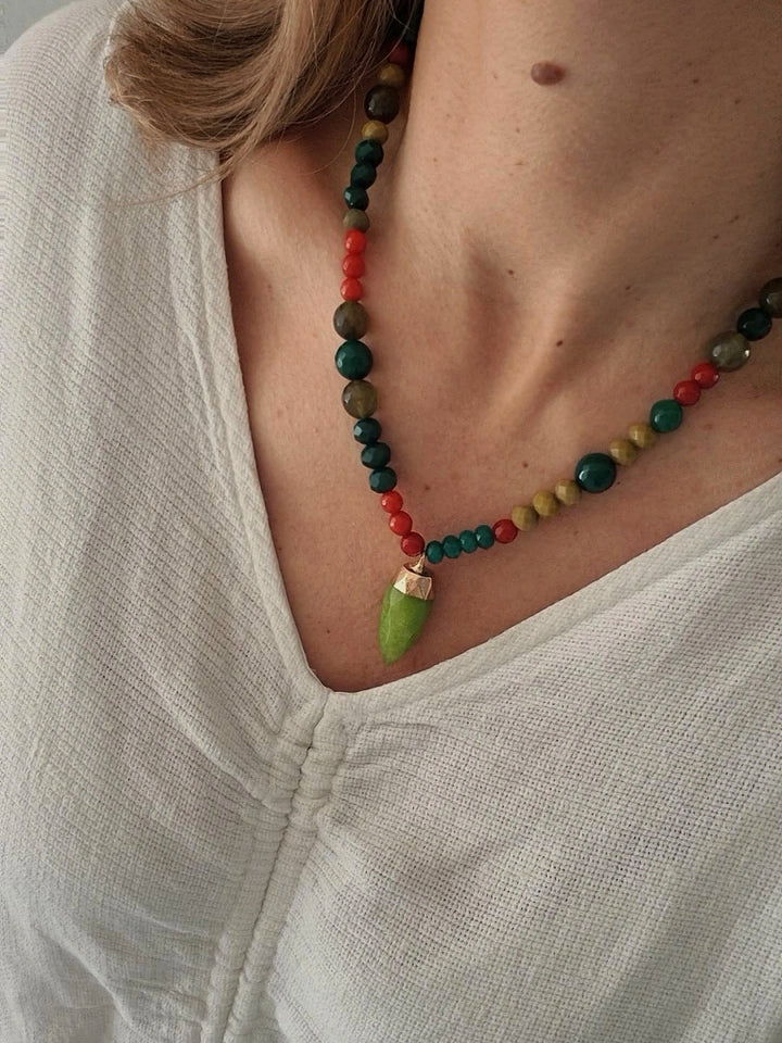 Este collar mezcla ágatas y cristales en tonos naranjas y verdes. Una combinación jugada, original y con toda la onda para transformar cualquier outfit en uno inolvidable.¿Minimalismo? No, gracias.