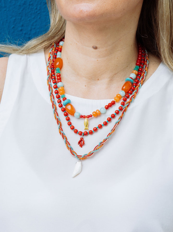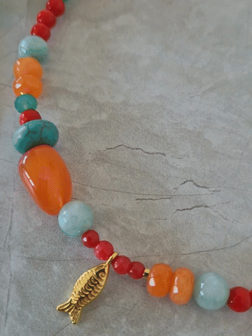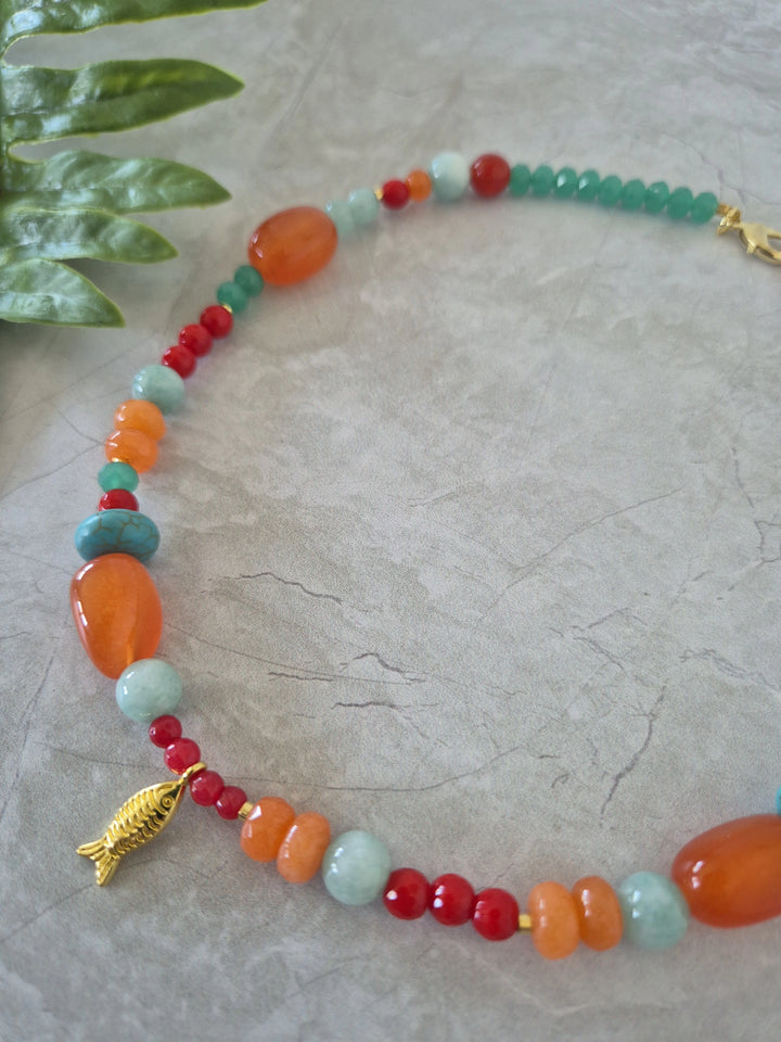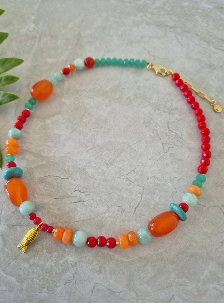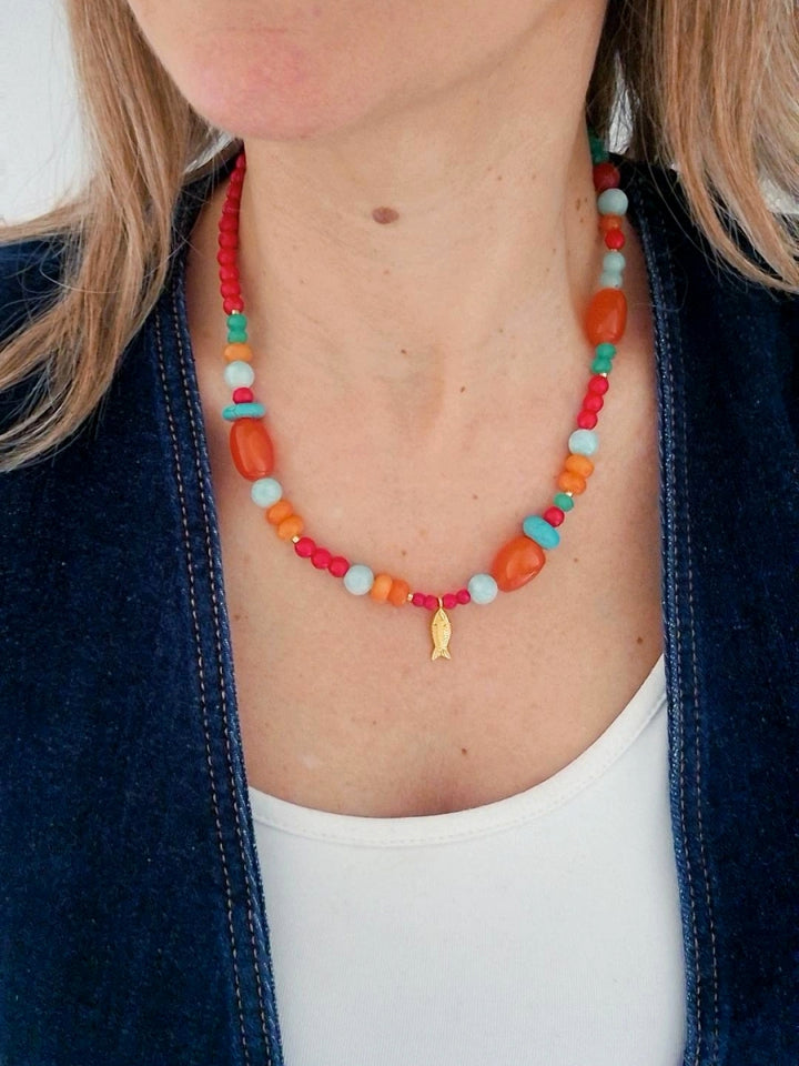 Un viaje directo al verano! Este collar está hecho para robar miradas: una mezcla explosiva de piedras en tonos coral, menta, rojo y turquesa, con un encantador pececito dorado que cuelga al centro como amuleto.