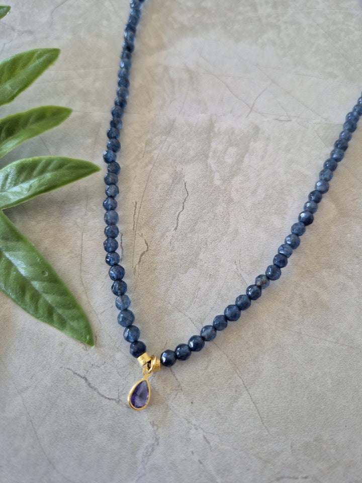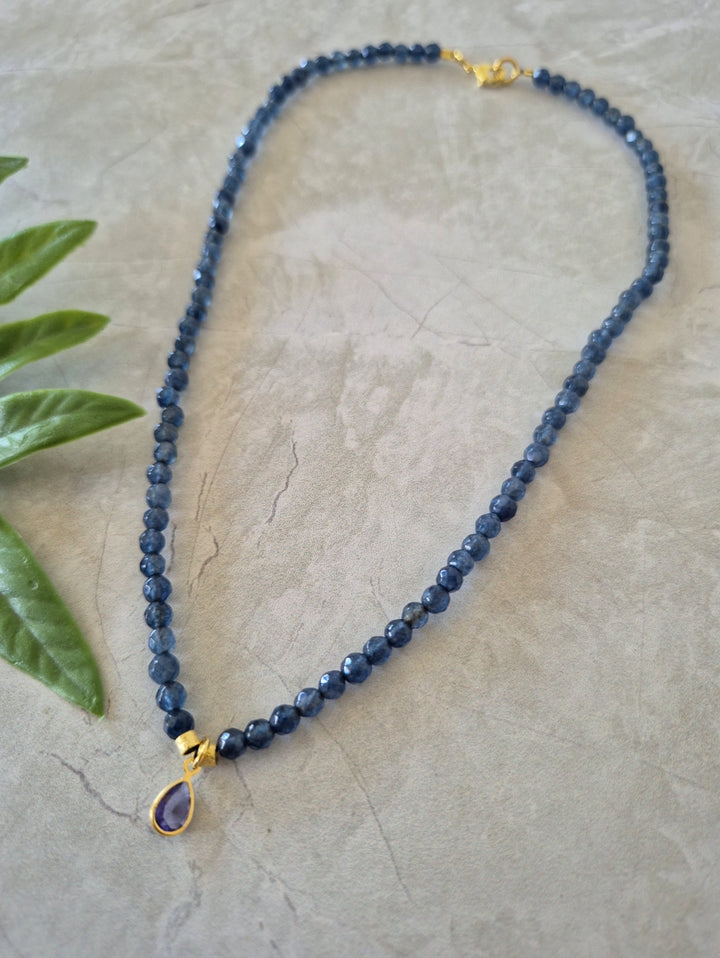 El collar Uma Azul está hecho con pequeñas ágatas facetadas en tono azul y un cristal morado al centro que le da un contraste increíble. Mide 42 cm y tiene terminaciones bañadas en oro. Es corto, cómodo y perfecto para usar todos los días o darle un toque especial a un look simple.