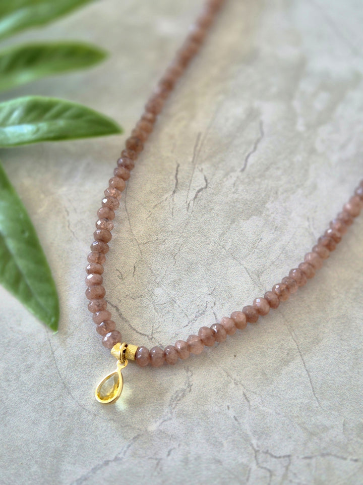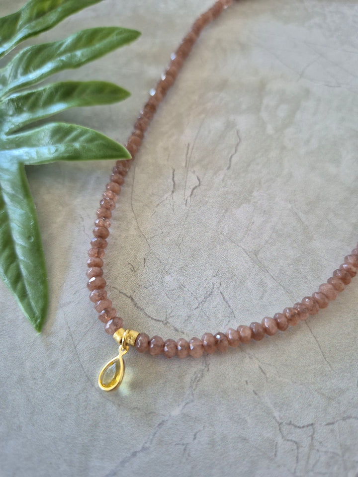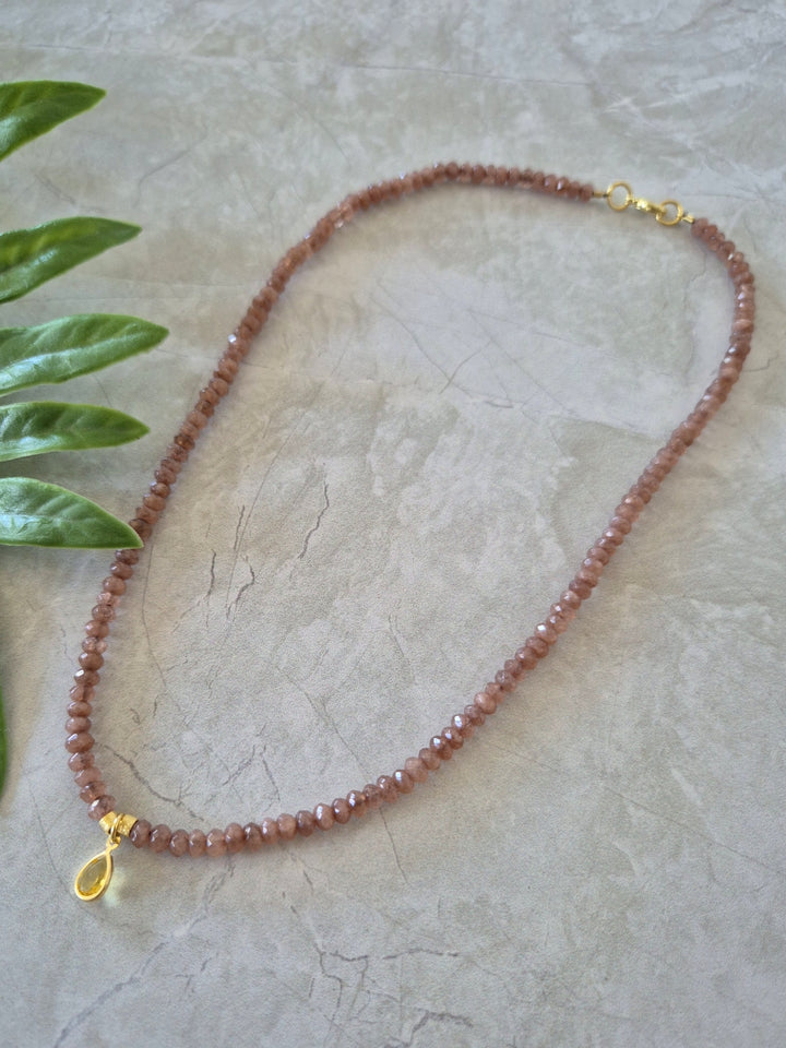 Este collar está hecho con pequeñas ágatas facetadas en tono café y un cristal dorado al centro que le da un contraste increíble. Mide 42 cm y tiene terminaciones bañadas en oro. Es corto, cómodo y perfecto para usar todos los días o darle un toque especial a un look simple.