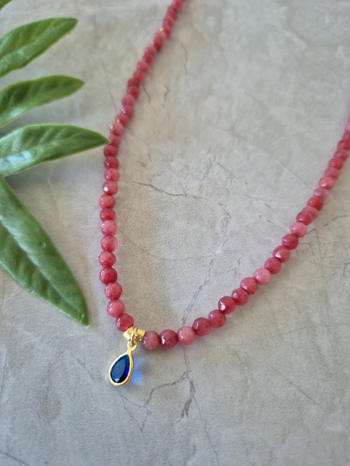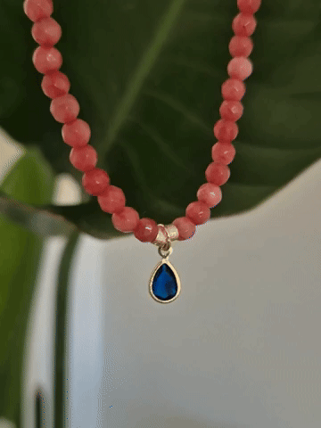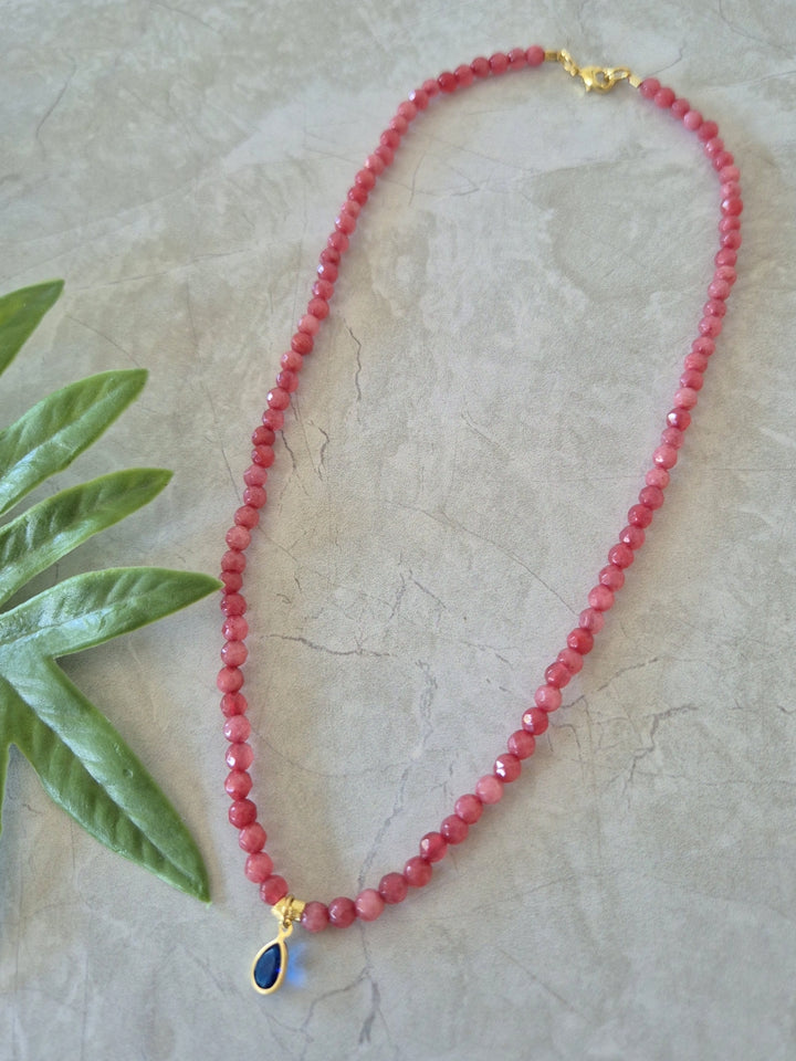 Este collar tiene ese equilibrio perfecto entre simpleza y estilo. Está hecho con pequeñas ágatas facetadas en tono rosado y un cristal azul al centro que le da el toque justo de color y frescura. Mide 42 cm, tiene terminaciones bañadas en oro y se ve increíble tanto solo como mezclado con otros collares.