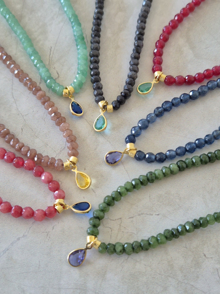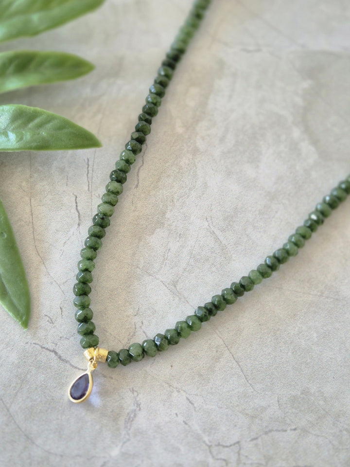 El collar Uma Verde está hecho con pequeñas ágatas facetadas en tono verde y un cristal morado al centro que le da un contraste increíble. Mide 42 cm y tiene terminaciones bañadas en oro. Es corto, cómodo y perfecto para usar todos los días o darle un toque especial a un look simple.