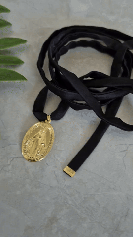 El Collar Virgen Seda Negra es más que un accesorio: es un amuleto de fe y protección que te acompaña todos los días. La medalla de la Virgen bañada en oro representa guía y fortaleza, mientras la seda negra le da un aire moderno y elegante que combina con todo.
