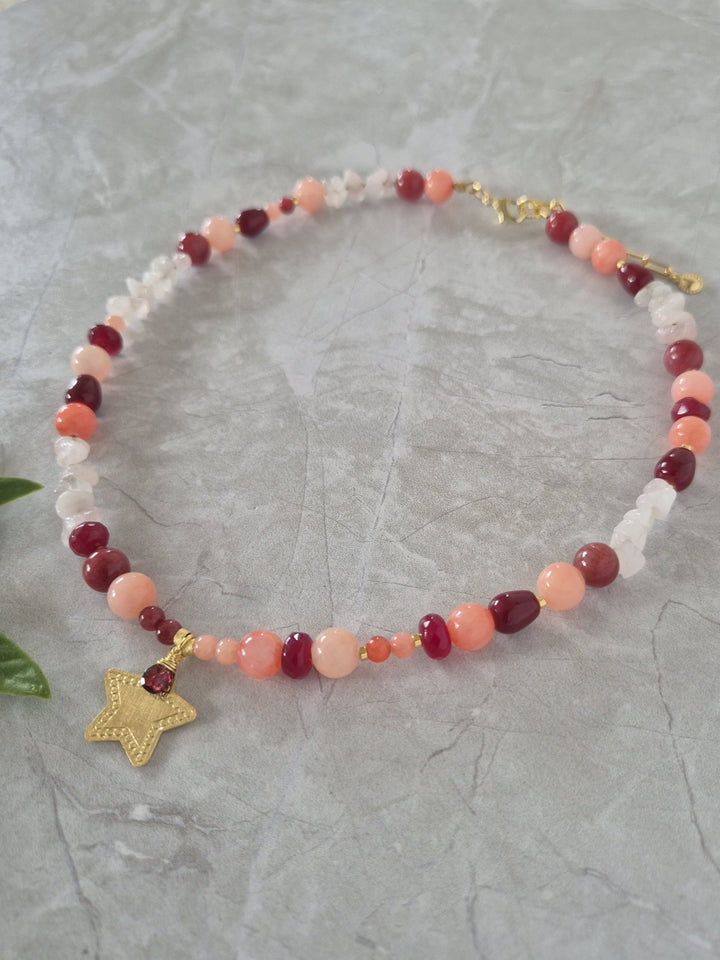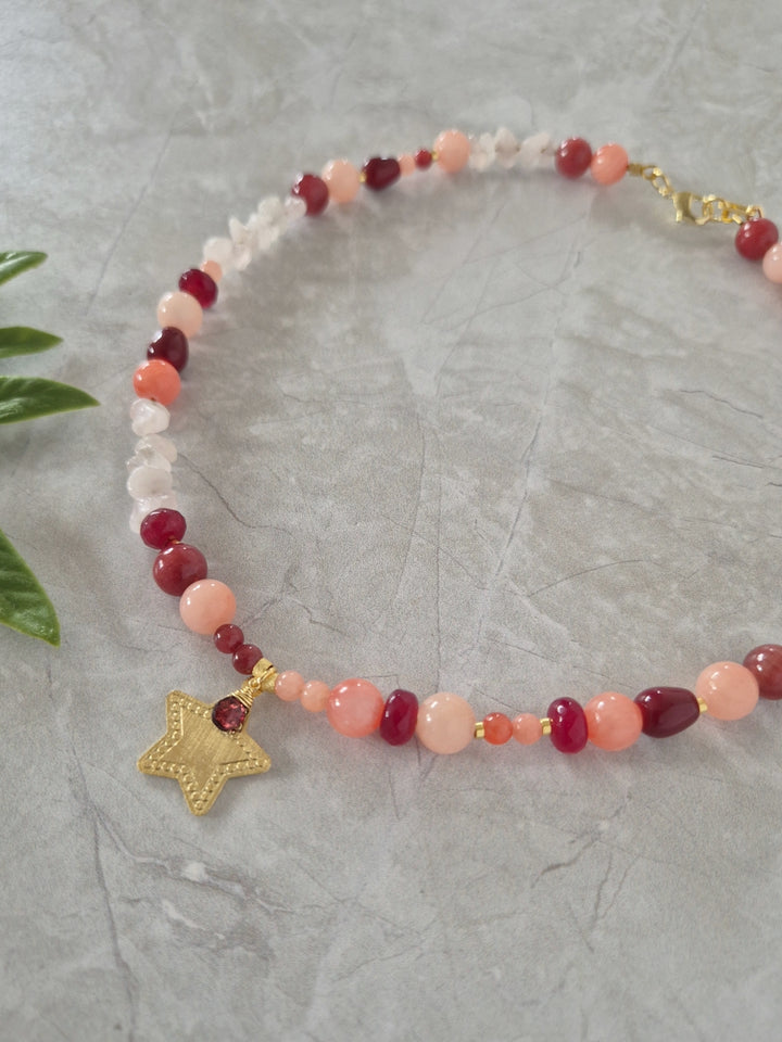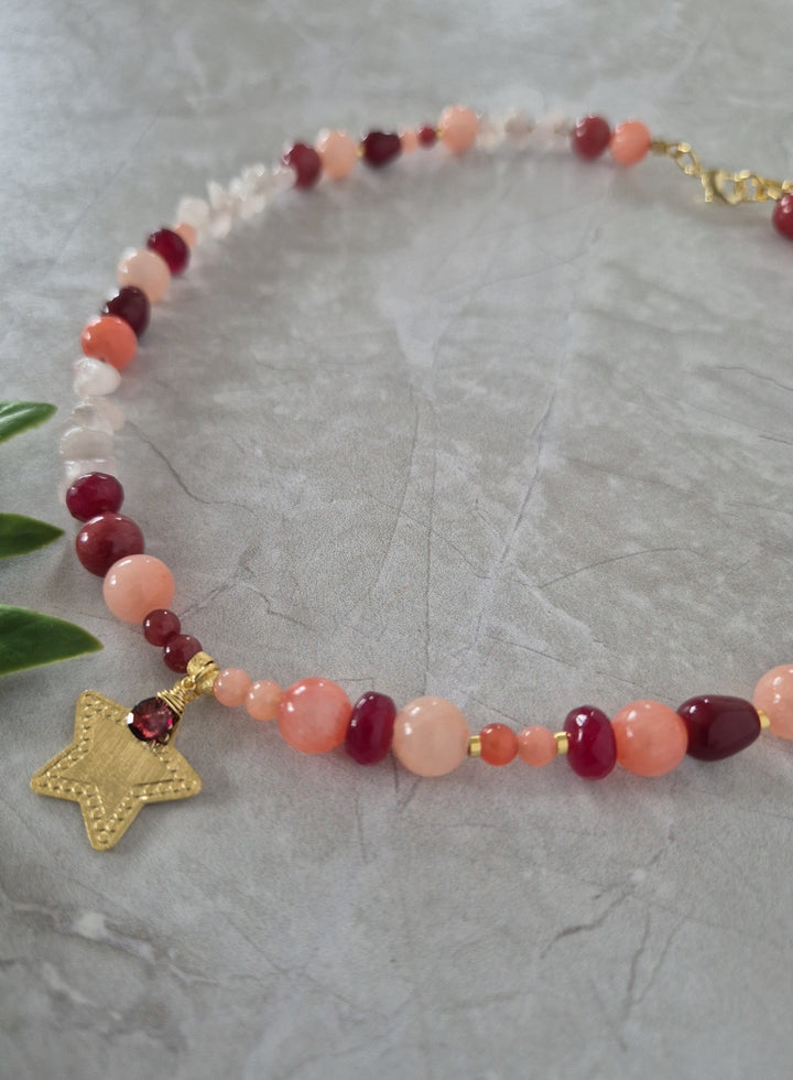 Un collar corto que combina piedras en tonos rosados, coral y burdeos, con un dije de estrellita bañada en oro, y sobre ella cae una piedra especial granate. La mezcla de colores cálidos y femeninos le da ese aire único, romántico y a la vez súper ondero, perfecto para usar de día o de noche.