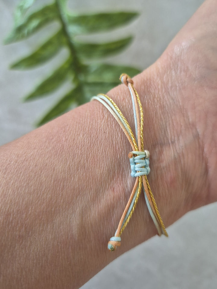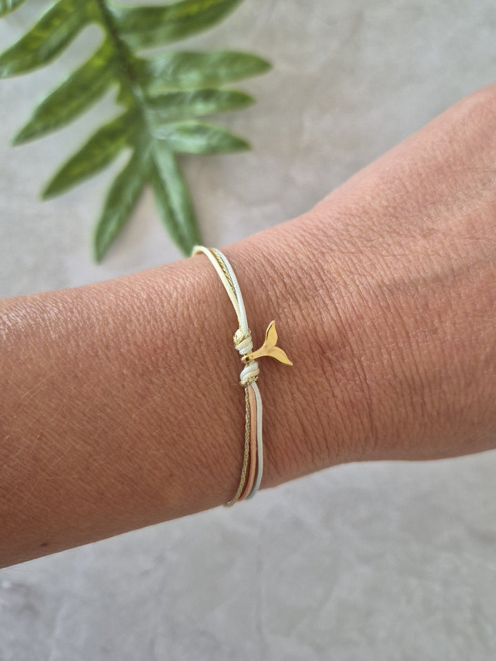 Una pulsera simple, y veraniega al 100%. Tres hilos delgados en tonos multicolores —con el celeste como protagonista— se unen en una mini colita de ballena bañada en oro, ese símbolo que grita libertad, mar y buena energía. Sistema de cierre ajustable