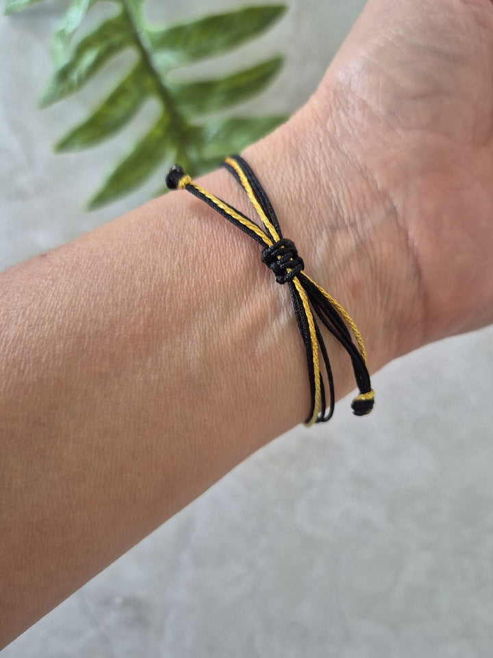 Una pulsera simple, y veraniega al 100%. Tres hilos delgados en tonos negro y dorado se unen en una mini colita de ballena bañada en oro, ese símbolo que grita libertad, mar y buena energía. Sistema de cierre ajustable