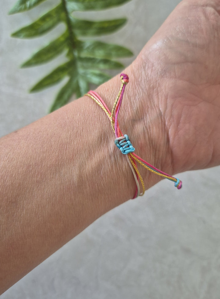 Una pulsera simple, y veraniega al 100%. Tres hilos delgados en tonos multicolores —con el rosado como protagonista— se unen en una mini colita de ballena bañada en oro, ese símbolo que grita libertad, mar y buena energía. Sistema de cierre ajustable