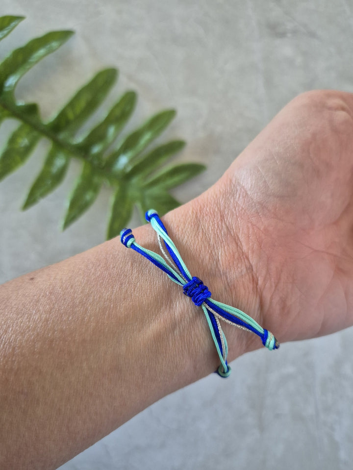 Una pulsera llena de ternura y simbolismo, ideal para regalar en la Primera Comunión o en momentos significativos. Hilos anudados en tonos azules, plateado y menta con cierre ajustable.