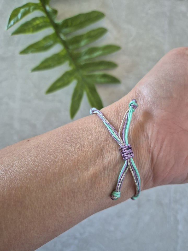 Una pulsera llena de ternura y simbolismo, ideal para regalar en la Primera Comunión o en momentos significativos. Hilos anudados en tonos lilas, plateado y menta con cierre ajustable.